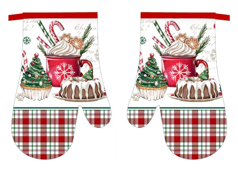 Komplet 2 rękawic kuchennych z nadrukowanym motywem, z magnesem. Rękawice chronią przed poparzeniem. Rozmiar rękawic: 16x27 cm. Materiał 100% poliester, wypełnienie z 100% włókniny poliestrowej. Komplet złożony z 2 szt. rękawic (prawa i lewa). Temperatura prania 30°C.