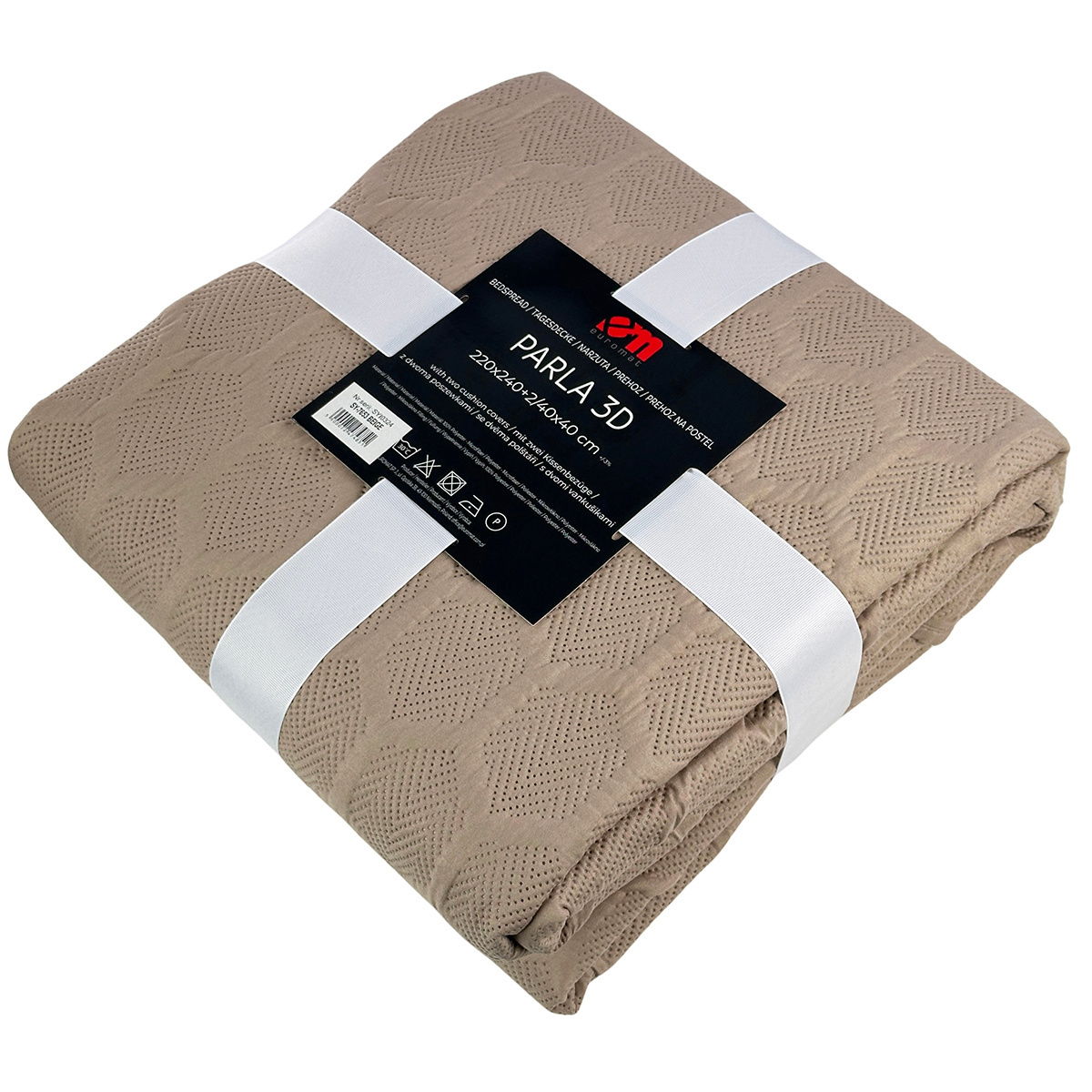 - Narzuty PARLA 3D – dwustronne, jednobarwne z ozdobnym, trójwymiarowym tłoczeniem 3D.Tkanina: 100% matowe mikrowłókno poliestrowe, wypełnienie: 100% poliester. Nowoczesne wzornictwo. Wyprodukowane w Chinach