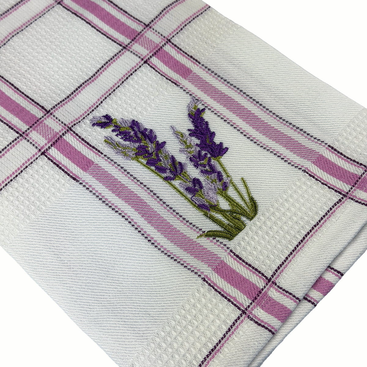 - Ścierki kuchenne LAWENDA. 93% bawełna, 7% poliester (bordiura+haft). Rozmiar 45x65 cm, gramatura 220g/m2. Biała "waflowana" tkanina z kolorowo-tkanym wzorem kraty w 4 kolorach: niebieski, zieleń, czerwień, lawenda i wyhaftowanym kwiatem lawendy.