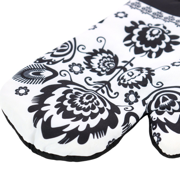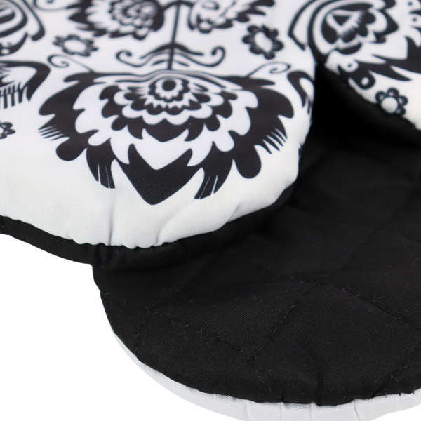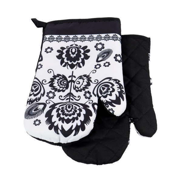Komplet 2 rękawic kuchennych z nadrukowanym motywem z magnesem. Rękawice chronią przed poparzeniem. Rozmiar rękawic: 16x27 cm. Materiał 90% poliester, 10% bawełna z nadrukiem, wypełnienie z włókniny poliestrowej. Komplet złożony z 2 szt. rękawic (prawa i lewa). Temperatura prania 30°C.