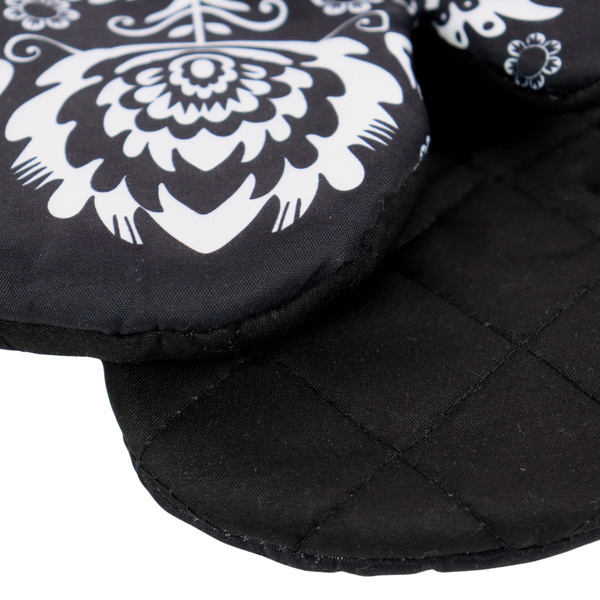 Komplet 2 rękawic kuchennych z nadrukowanym motywem z magnesem. Rękawice chronią przed poparzeniem. Rozmiar rękawic: 16x27 cm. Materiał 90% poliester, 10% bawełna z nadrukiem, wypełnienie z włókniny poliestrowej. Komplet złożony z 2 szt. rękawic (prawa i lewa). Temperatura prania 30°C.