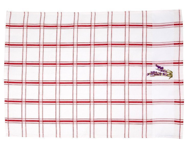 - Ścierki kuchenne LAWENDA. 93% bawełna, 7% poliester (bordiura+haft). Rozmiar 45x65 cm, gramatura 220g/m2. Biała "waflowana" tkanina z kolorowo-tkanym wzorem kraty w 4 kolorach: niebieski, zieleń, czerwień, lawenda i wyhaftowanym kwiatem lawendy.