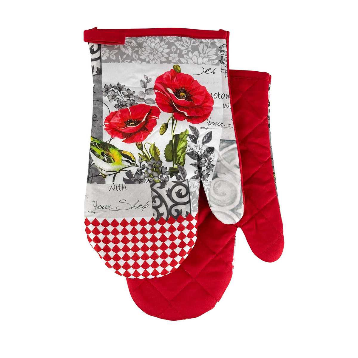 Komplet 2 rękawic kuchennych z nadrukowanym motywem, z magnesem. Rękawice chronią przed poparzeniem. Rozmiar rękawic: 16x27 cm. Materiał 100% poliester, wypełnienie z 100% włókniny poliestrowej. Komplet złożony z 2 szt. rękawic (prawa i lewa). Temperatura prania 30°C.