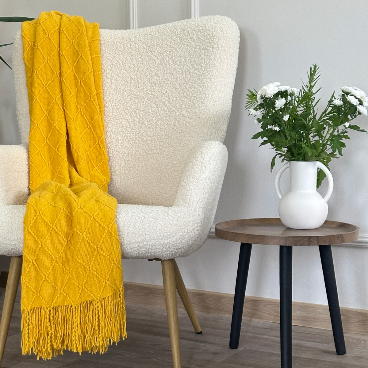 Koce NERIA – żakardowe z frędzlami. 100% acrylic. Żakardowy, strukturalny wzór 3D. Jednobarwne, gramatura 280g/m2. Wyprodukowane w Chinach.