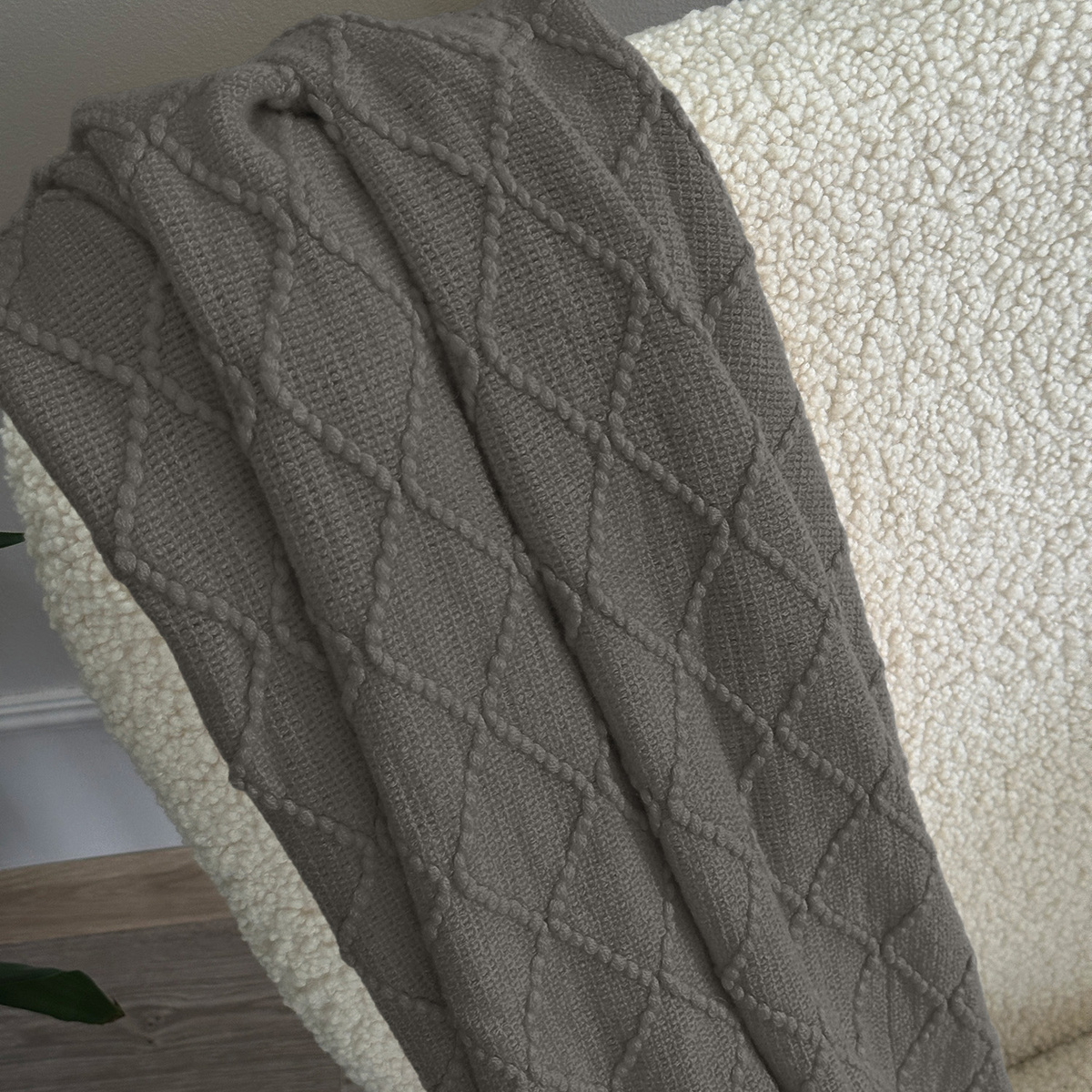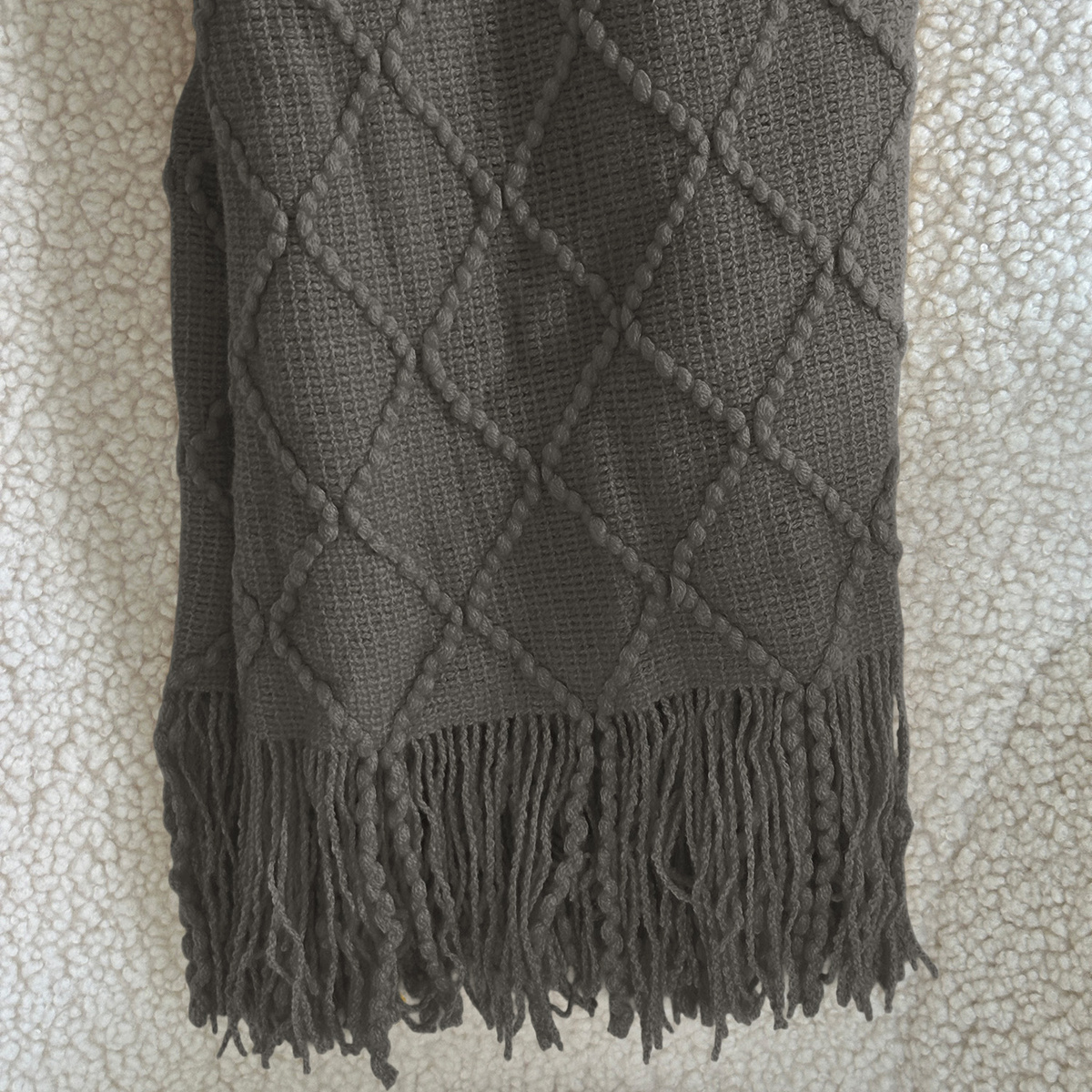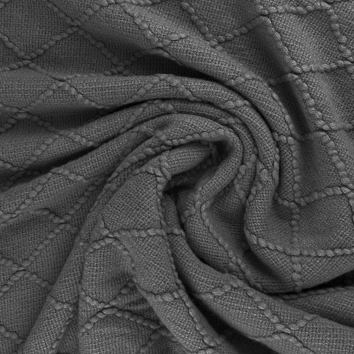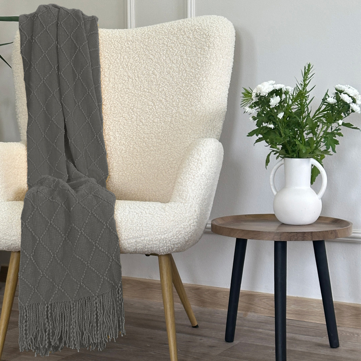 Koce NERIA – żakardowe z frędzlami. 100% acrylic. Żakardowy, strukturalny wzór 3D. Jednobarwne, gramatura 280g/m2. Wyprodukowane w Chinach.
